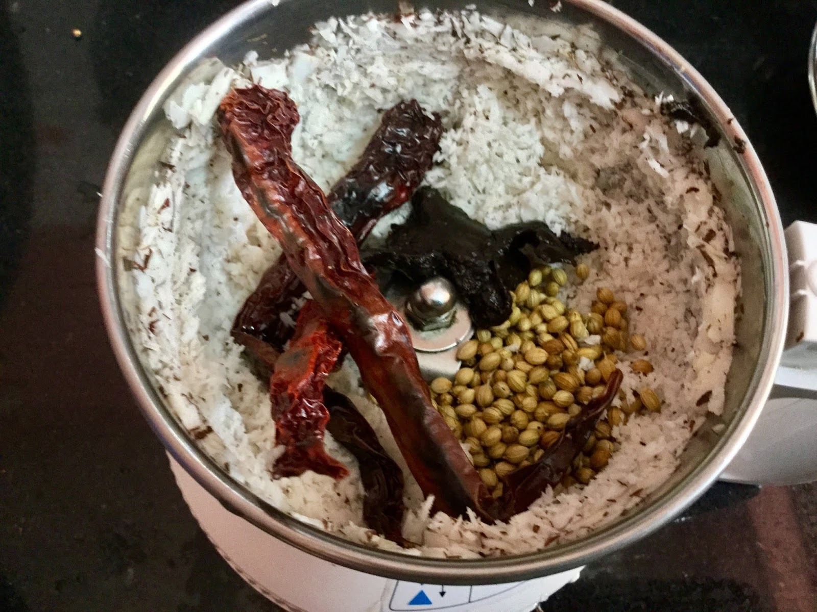 Grind coconut gratings along with the roasted red chillies, raw coriander seeds,