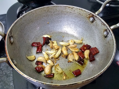 Heat a kadai with oil,add the crushed garlic.When the colour is changed add the broken chillies,fry for a second.