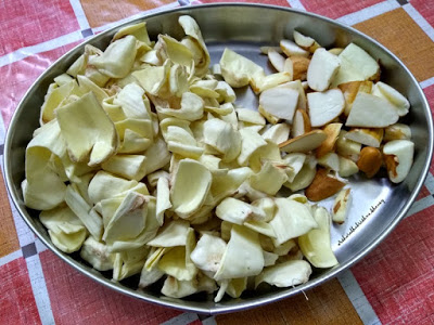 Chop roughly the jackfruit bulbs removing the seeds and the thick skin inside it.