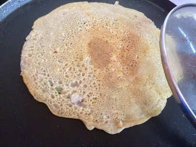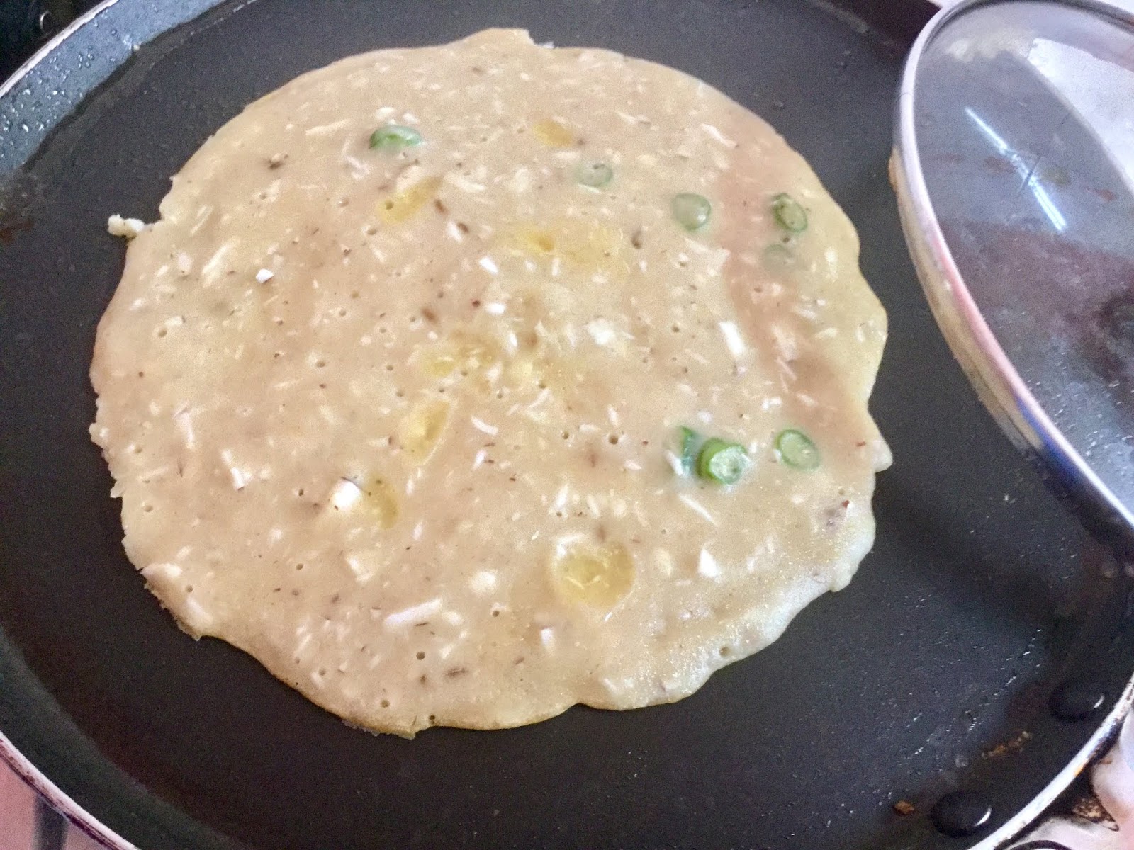 Heat a tawa on medium heat and spread the batter a little thicker than your regular dosa ! .Drizzle some Coconut oil or ghee over it . Cover and let cook on low to medium flame .