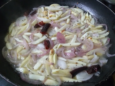 Heat a kadai with oil,splutter mustard add red chillies broken into pieces.Fry for few seconds.Add chopped onion and fry until they are soft.