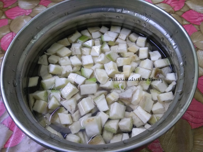 1. Wash and peel the skin of the banana.Cut them into small cubes and drop immediately in water to avoid discolouration.