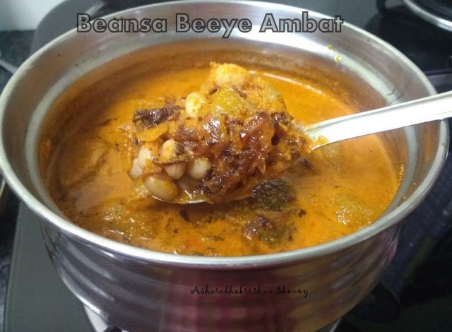 So today its the seed (called bee in Konkani),we are going to make use for this ambat. This variety beans is known in various names like, white/pink beans, Dragon tongue beans,romano beans etc.The seeds inside this beans are a swirl of pink and cream in colour. They have a nutty and creamy texture when cooked.