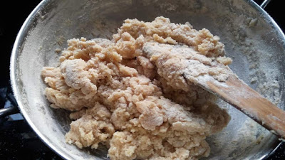 - Add 1 cup wheat flour, mix well stirring continuously until it becomes a lump and all the water is absorbed by the flour.