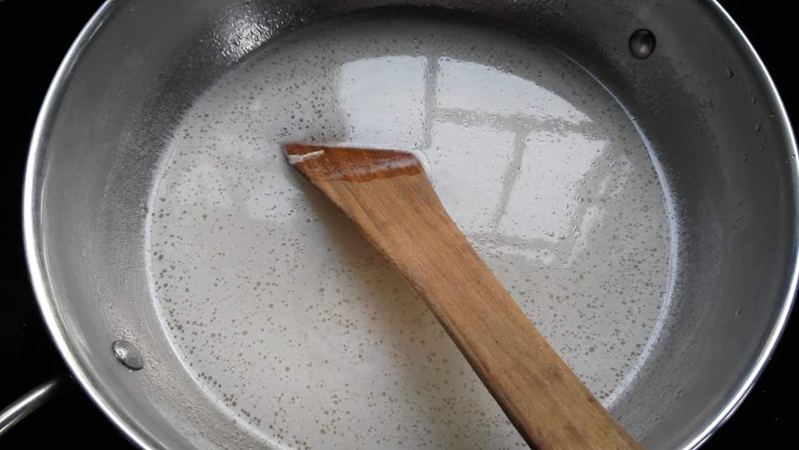 - Heat a thick bottomed kadayi, add 1 cup of water, 1 tbsp of wheat flour, ghee and salt, mix well so that there are no lumps. Boil well