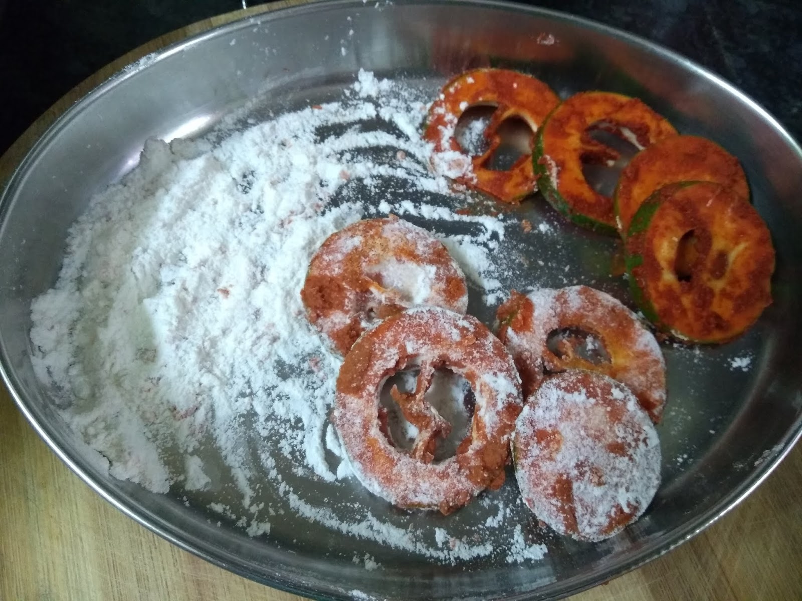 - Dust/roll the masala coated roundels in the rice powder on both sides.