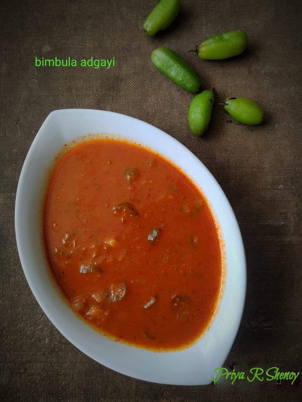 There are many spicy dishes in this blog – you can check here . Here is yet another spicy dish by my dear friend Priya R Shenoy . It’s called Bimbla Adgayi ( tha’s how her mother calls it ! ) , this is a spicy and tangy dish enhanced by the mild sweetness imparted by onion ! So when you get some fresh Hog plums / bimuls / birmi karmbals – you can try this out !