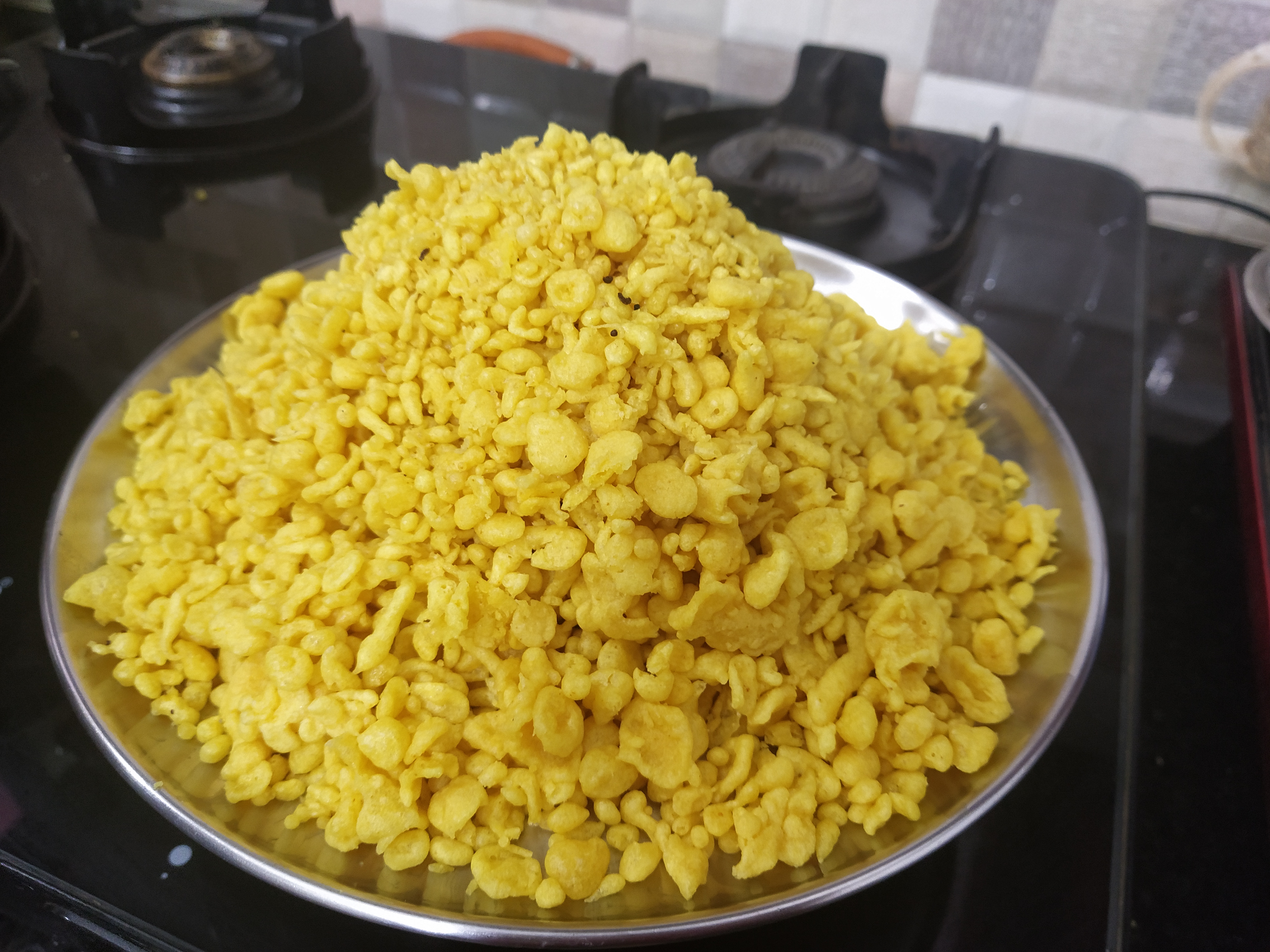 - Collect all the boondis thus fried and keep aside . It’s quite ok if they are large sized or of uneven shape because you can crush the boondis to smaller size and after binding – the unevenness will not be very visible.