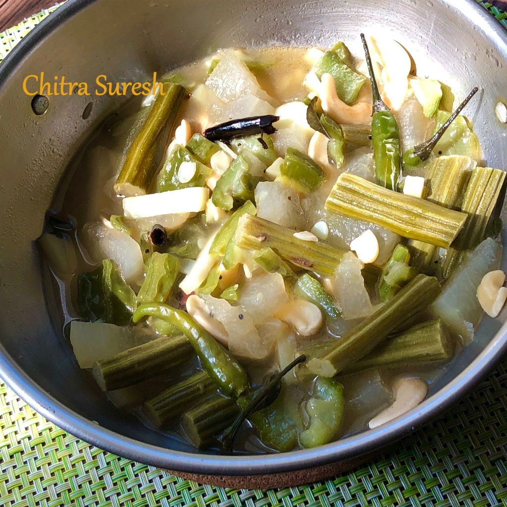 When a lot of different types of veggies are added in an upkari – it gives an all together different mouth watering taste combining all the flavours . Here is one such upkari contributed by my dear friend Chitra Suresh . 4 types of veggies and Cashewnuts together give an aromatic combo .