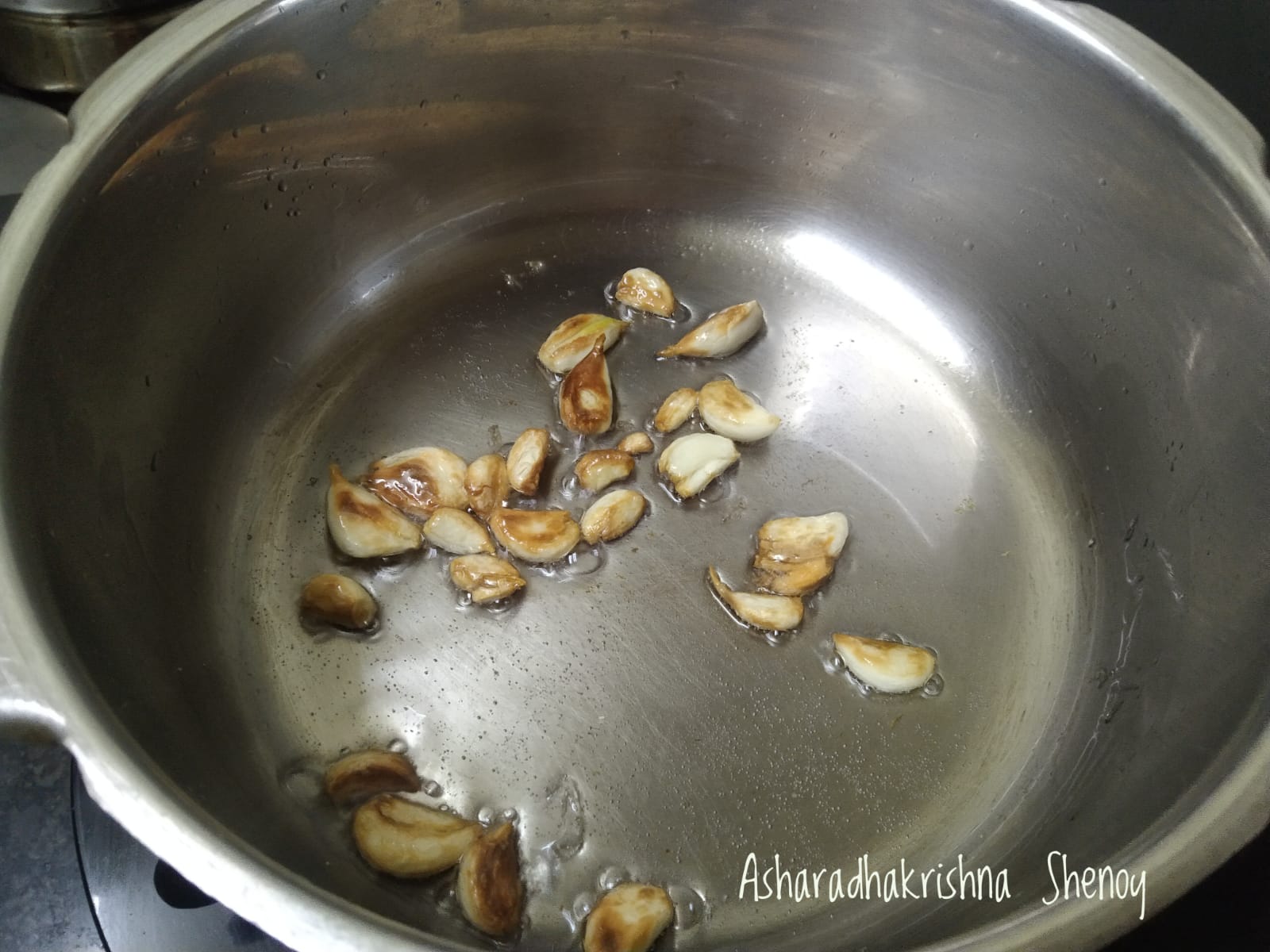 - In a heavy bottom pan heat oil. When hot enough add the crushed garlic and fry till slightly brown. Take care not to burn it.
