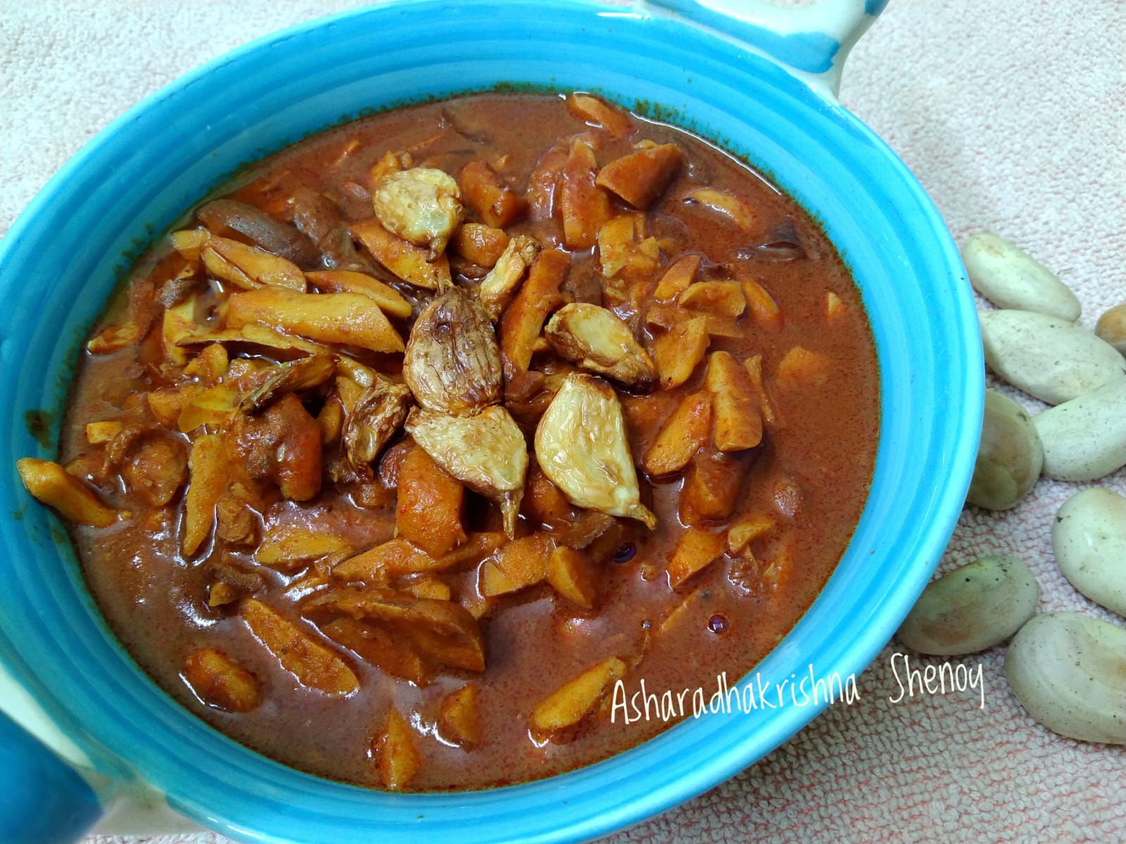 Bikkand in Konkani means Jackfruit seed. These seeds are edible and highly nutritious. We Konkanis include it in many curries. Today I’m sharing a simple and spicy curry made with bikkand which is seasoned with garlic. This can be served as an accompaniment with rice or can be served with panpolo or undi. Please refer preserving method of bikkand and to know various other curries including bikkand is already shared in this blog. Now lets get into the recipe